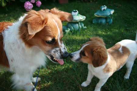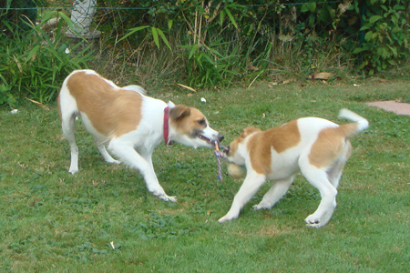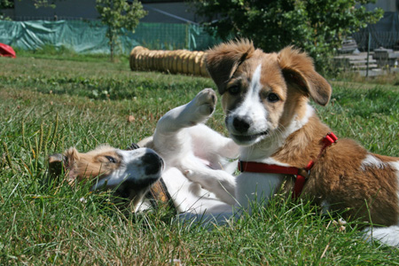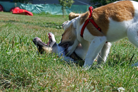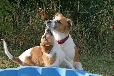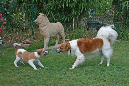 Die Zweibeiner sind machtlos. Duschkas Mama muss her. Vielleicht kann sie ihr ins Gewissen reden, ihr klar machen, dass es so nicht weitergehen kann. Und siehe da, Duschka begrüßt Chiva ganz unterwürfig. Da werden die Ohren angelegt, die Lefzen abgeschleckt, da legt sie sich auf den Rücken...