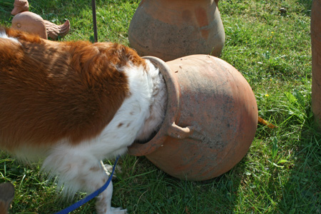 Meine Hürden, Slalomstangen und der Tunnel sind aus dem Garten verschwunden, alles muss „kindersicher“ gemacht werden. Dafür haben wir jetzt zwei Muscheln, eine mit Bällen, die andere mit Wasser (Duschka liebt Wasser). Kleine Umgestaltung der Lebensräume, die meine Zustimmung selbstverständlich nicht findet.